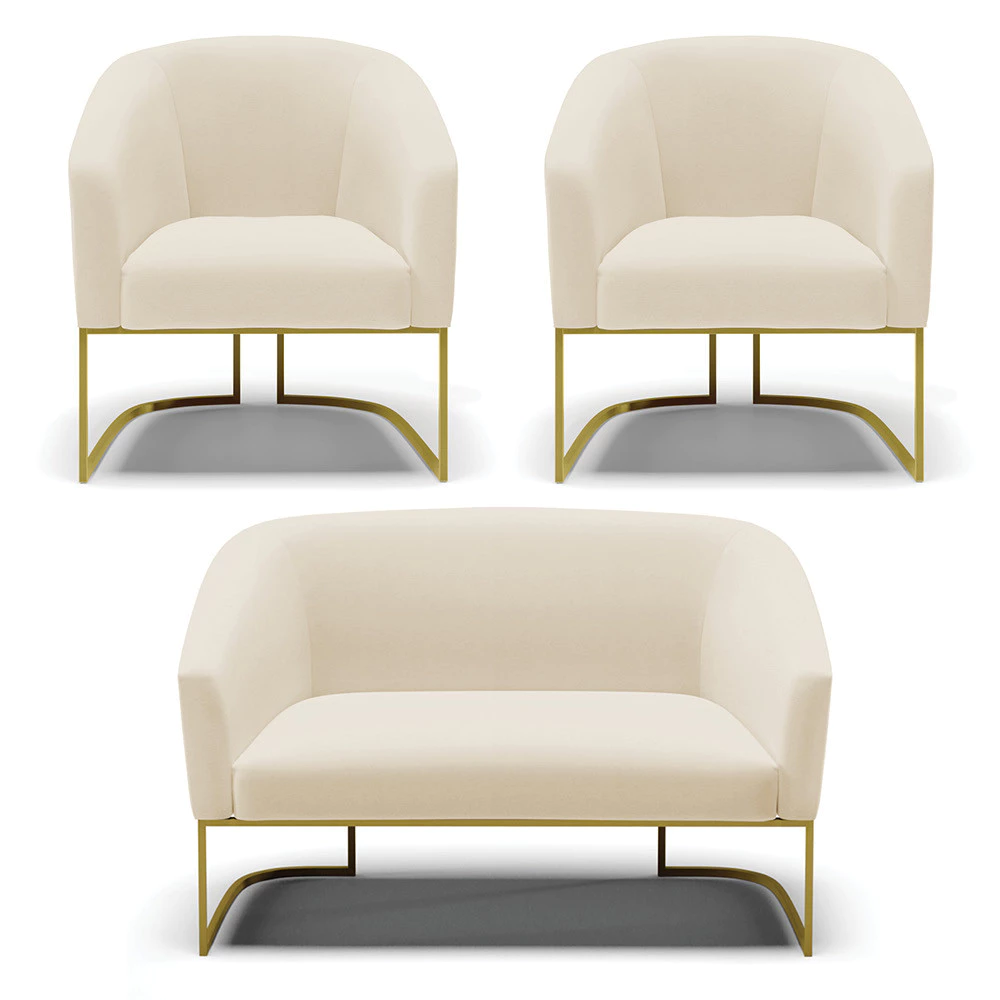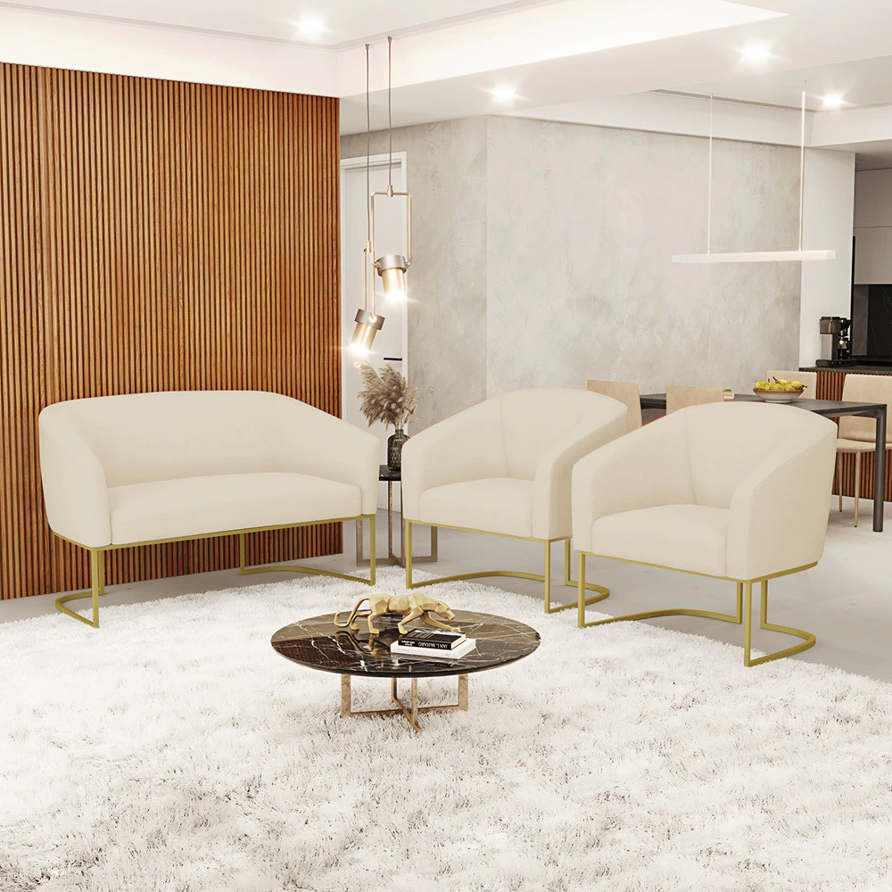 Sofá 2 Lugares e 2 Poltronas Base Industrial Dourado Stella Linho